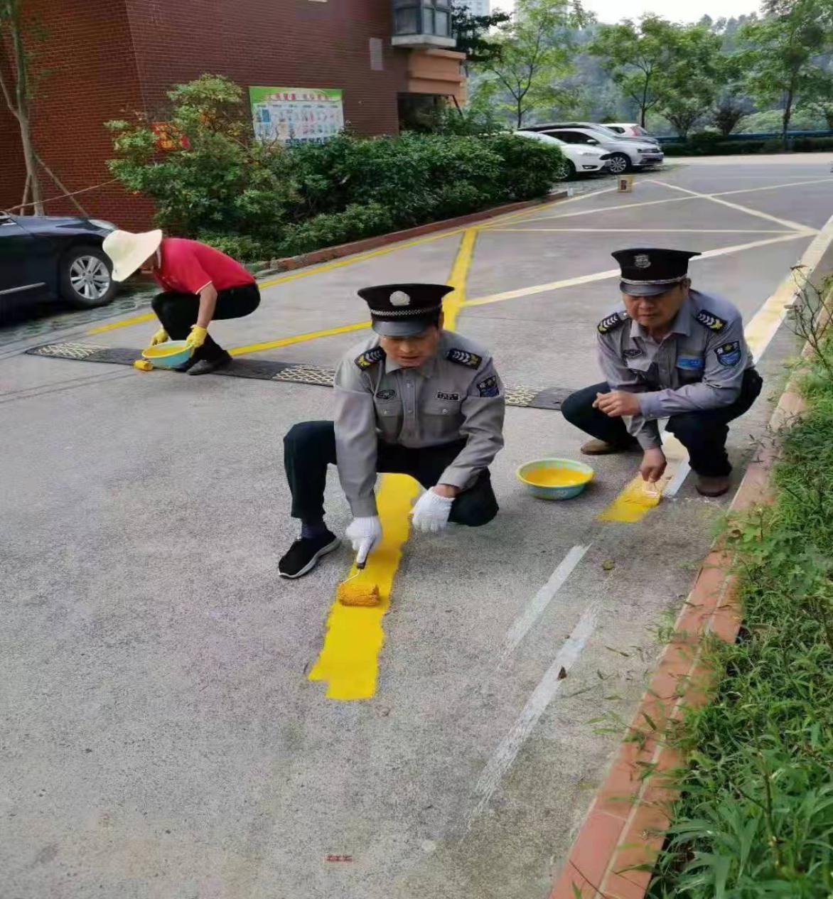 (圖為物業(yè)工作人員劃停車(chē)線、消防通道線)