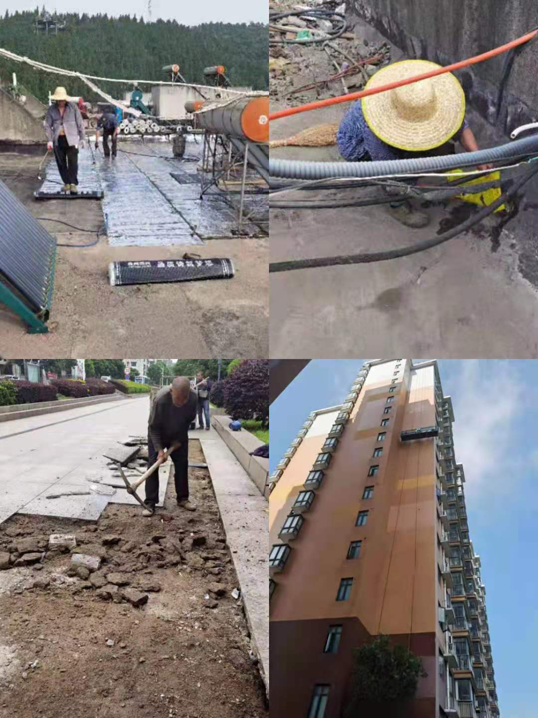 (圖為維修人員在維修屋面、外墻滲水;小廣場(chǎng)路面)